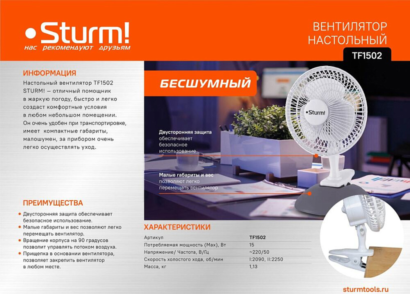 Современный настольный вентилятор Sturm! станет незаменимым помощником в душном офисе и в любом малогабаритном пространстве. Прибор отличается компактностью и легкостью. Его можно поставить даже на небольшую поверхность - стол, подоконник, полку.