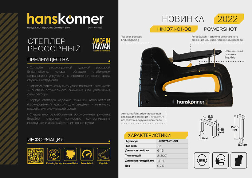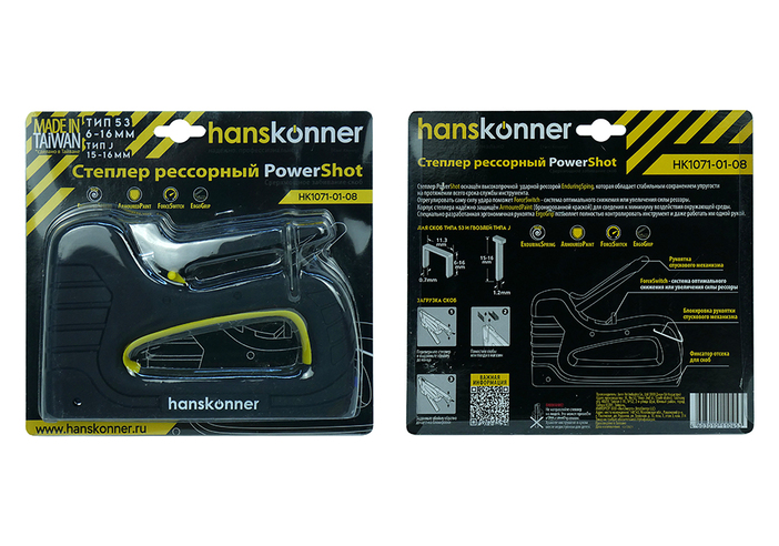 Степлер Hanskonner HK1071-01-08. Степлер PowerShot оснащён высокопрочной ударной рессорой EnduringSping, которая сохраняет упругость на протяжении всего срока службы инструмента.