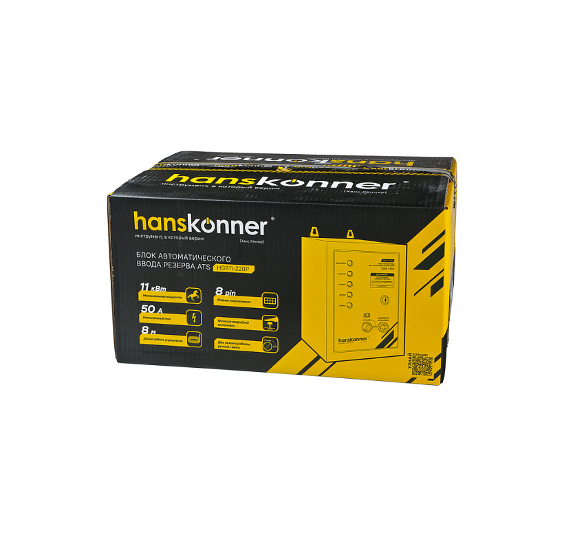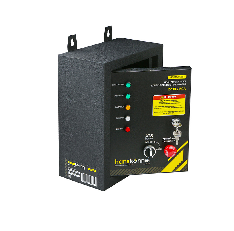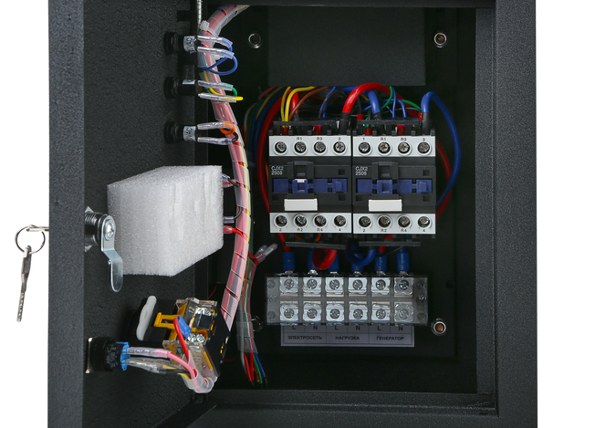Блок автоматического ввода резерва (АВР) предназначен для автоматического переключения питания с основной, однофазной, сети на резервный бензиновый генератор при отключении электроэнергии. После восстановления основного электроснабжения система автоматически возвращает нагрузку на сеть и останавливает генератор.
