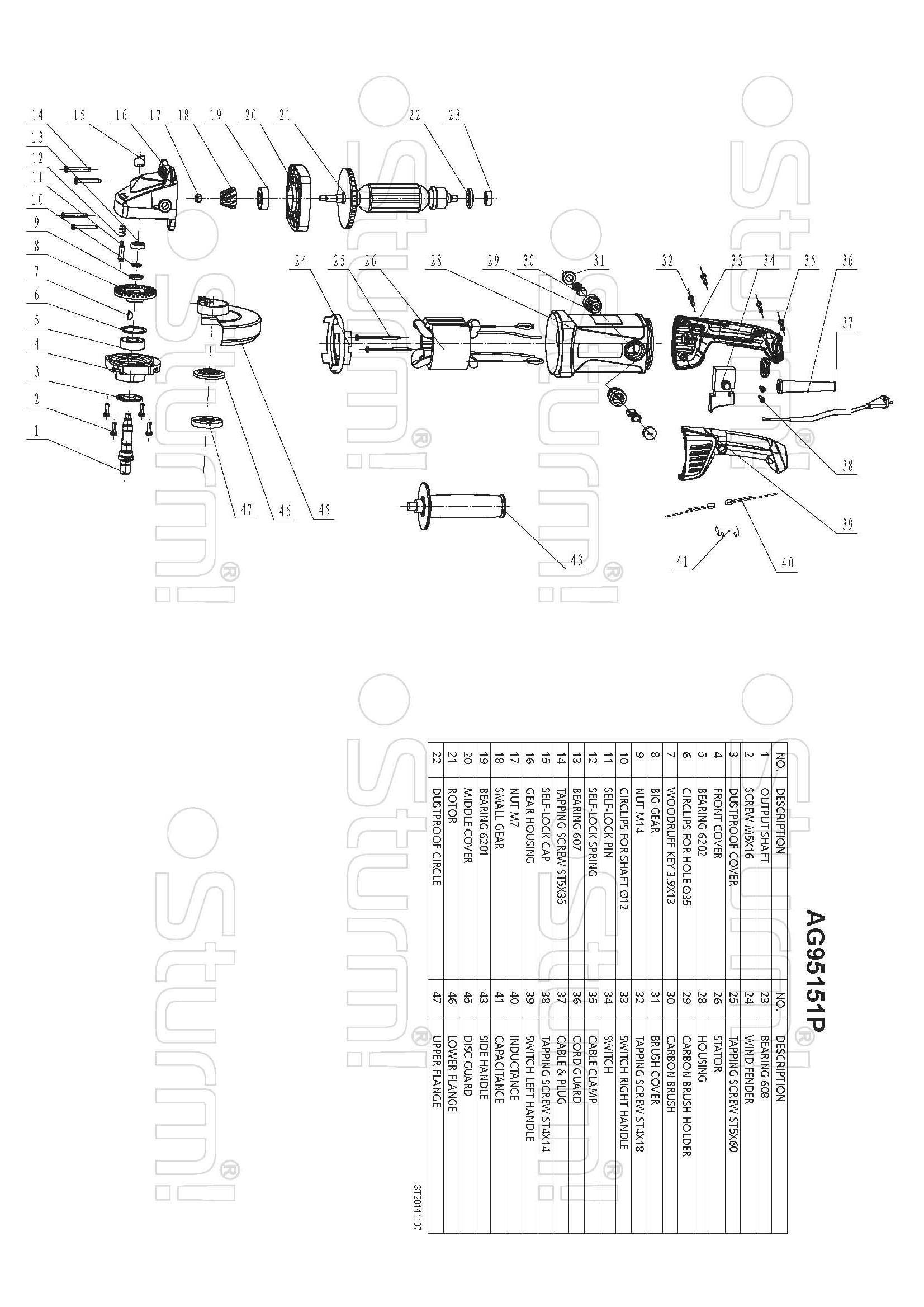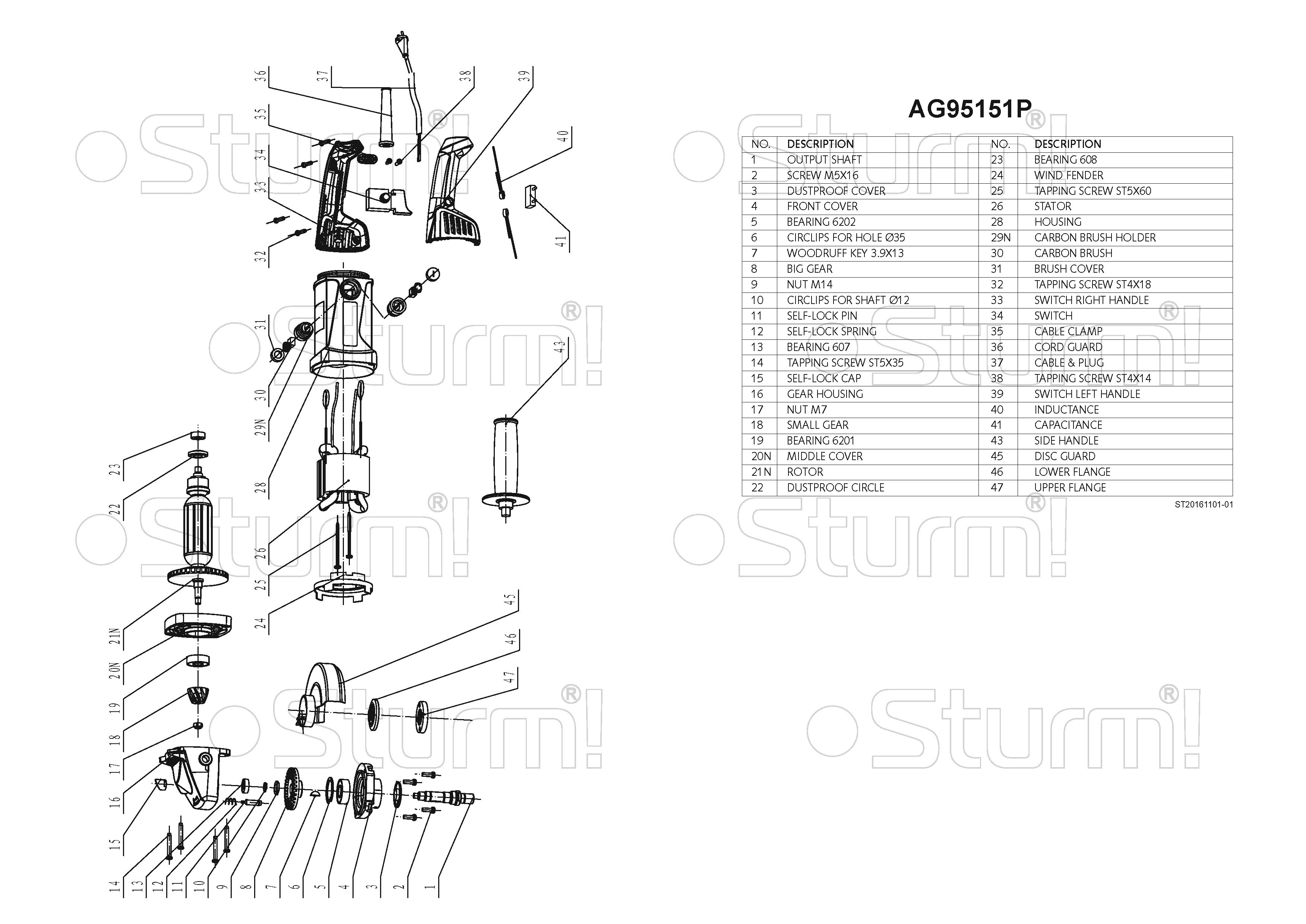 Sturm AG95151P – мощная универсальная болгарка (УШМ) под рабочий диаметр диска 150 мм. Имеет компоновку с длинной рукоятью, что обеспечивает удобство использования и лучший контроль инструмента при зачистных работах. Модель оснащена производительным 1400 ваттным электромотором, гарантирующий запас по мощности даже при энергоемких операциях и позволяющий использование различных типов оснастки, включая алмазные чашки для шлифовки по камню. Являясь представителем профессиональной серии инструмента Sturm, болгарка Sturm AG95151P обладает повышенными показателями по надежности и ресурсу, как за счет применения высококачественных комплектующих (фирменные подшипники C&U), так и благодаря продуманной, с запасом по прочности, конструкции : электромотор покрыт несколькими изоляционными слоями термостойкого лака и имеет защиту от пыли и абразивных частиц, благодаря закалке, повышенной износостойкостью обладают шестерни редуктора, в качестве опор вала шпинделя установлены шарикоподшипники, корпус инструмента изготовлен с использованием стойкого к ударам нейлона. Для дополнительного удобства пользователя, модель снабжена быстросъемным защитным кожухом, надежно фиксирующимся при помощи специального зажимного рычага. Предусмотрена возможность быстрого доступа к щеткам, упрощающая процесс их замены, так как исключает демонтаж элементов корпуса.